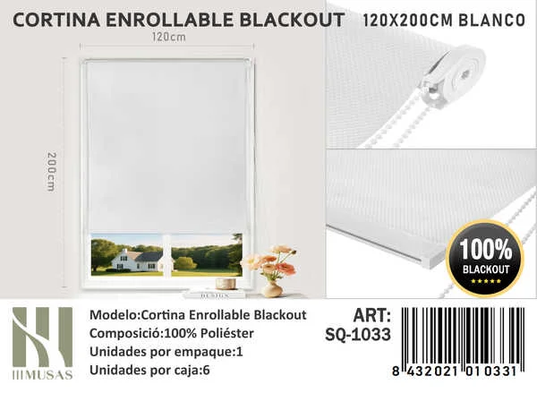 Cortinas Roller Blackout 120cm x 200cm Blanco SQ-1033