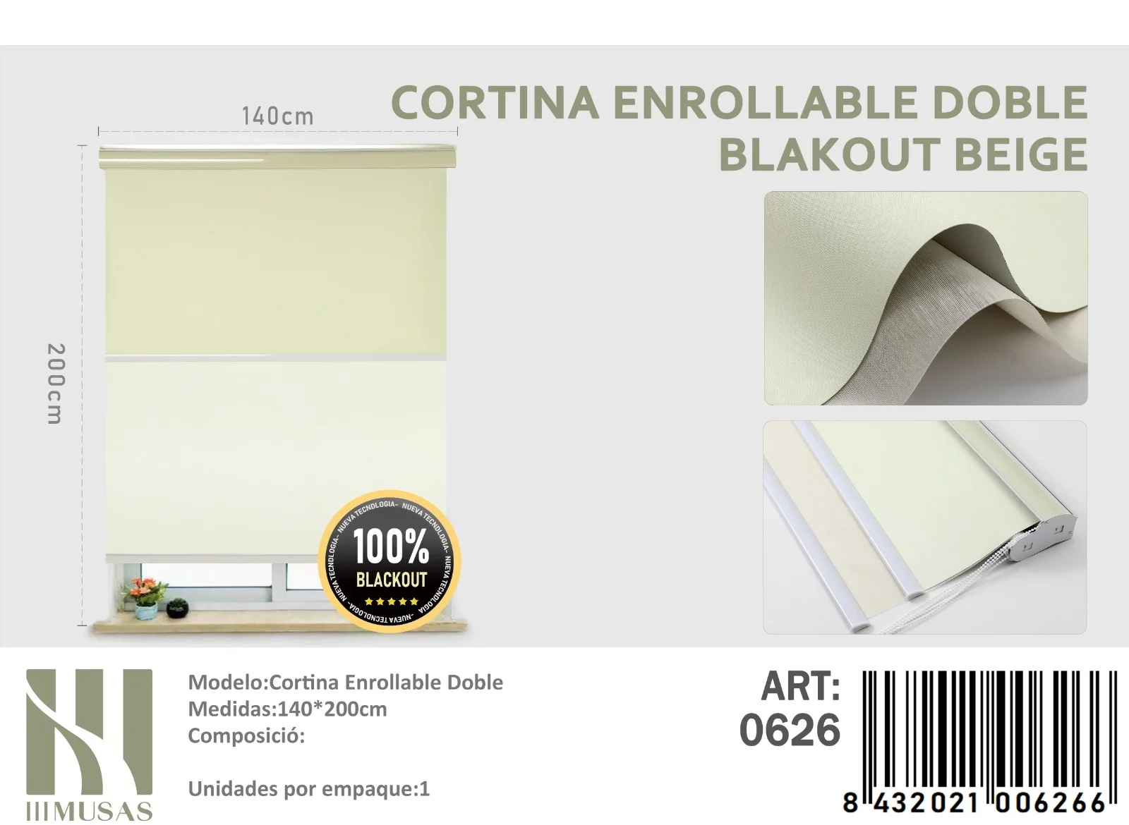Portada » Tienda » Cortinas Roller Blackout Doble 140cm x 200cm Beige 0626