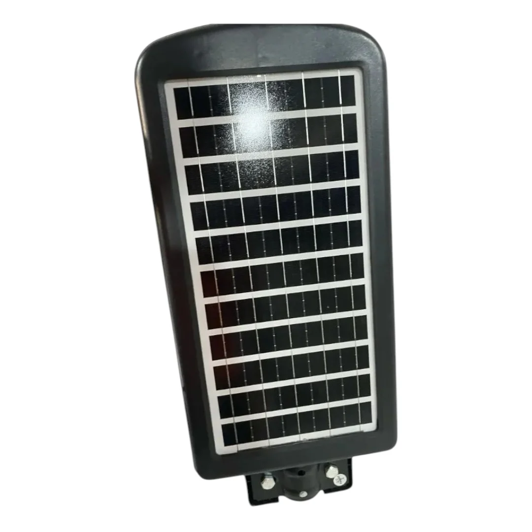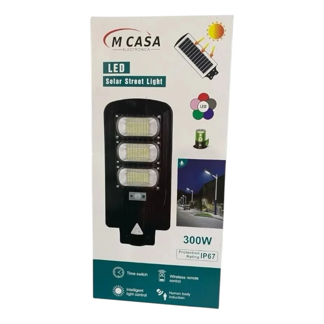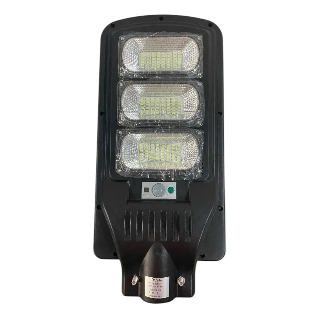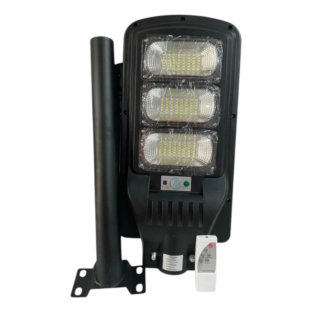 LAMPARA DE CALLE 300W DE POTENCIA CON SENSOR DE MOVIMIENTO. SE PUEDE PROGRAMAR PARA DEJAR UNA LUZ BRILLATE CONSTANTE O ACTIVAR EL SENSOR DE MOVIMIENTO EL CUAL BAJA LA INTENCIDAD DEL BRILLO DE LA LUZ CUANDO NO DETECTA MOVIMIENTO. VIENE CON CONTROL REMOTO. TIENE UN SENSOR FOTOSENCIBLE QUE LA ACTIVA CUANDO NO HAY LUZ SOLAR Y LA APAGA AL AMANECER. Luz de calle LED 351 Potencia: 300 W LED: 351 * SMD3030 LED Capacidad de la batería: batería de litio de 15000 mah Tiempo de iluminación de carga completa: 8-10 horas Color de la luz: blanco frío Color de la carcasa: gris Material: ABS Área de irradiación: 120 metros cuadrados Tamaño del cuerpo de la lámpara: 300W: 615 * 237 * 55 mm Altura de instalación recomendada: 3-8 M Sistema de control: control remoto