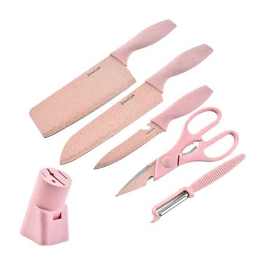 Juego de Cuchillos de Cocina con Pelador y Tijeras de Acero Inoxidable 5 piezas. Este juego de cuchillos todo en uno es un set especializado de acero para todas tus necesidades de picado. Esta línea de cuchillos de acero inoxidable está fabricada con materiales de la más alta calidad para brindarte productos duraderos, precisos y seguros. Todos los mangos son de diseño de formas ergonómicas que proveen un manejo superior, cómodo y seguro. Las hojas son de acero inoxidable con alto contenido de carbón resistente a manchas y a la corrosión, han sido endurecidas para mantener su filo por largo tiempo. Son cuchillos de acero inoxidable que tienen un recubrimiento de cerámica, y el mango está fabricado en Plástico ABS totalmente seguro y ergonómico.