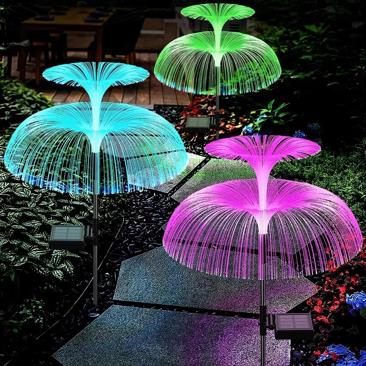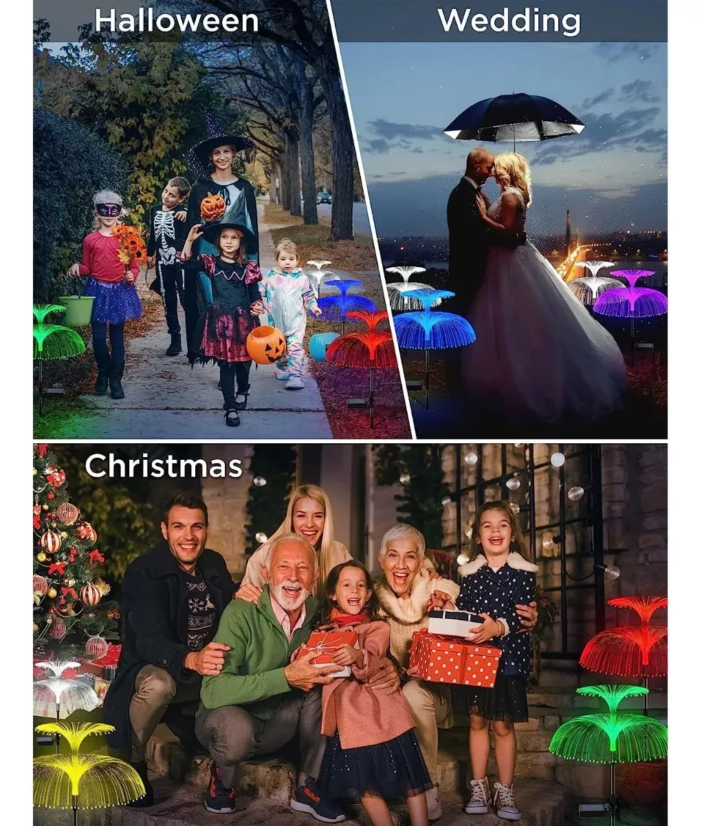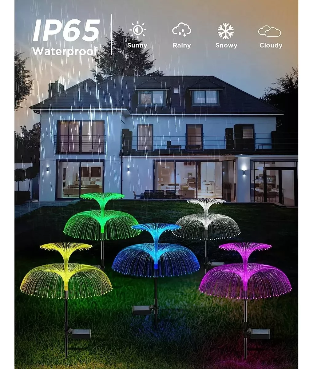 – La luz solar de jardín para exteriores está diseñada con una forma única de lluvia de medusas/meteoritos, utilizando más fibras ópticas para aumentar el swing de la luz de las medusas, haciendo que el jardín nocturno de ensueño sea una realidad y añadiendo un ambiente romántico a tu patio.
