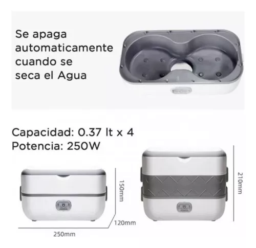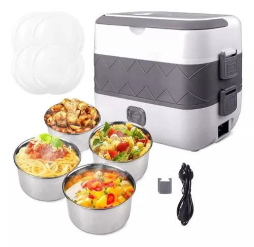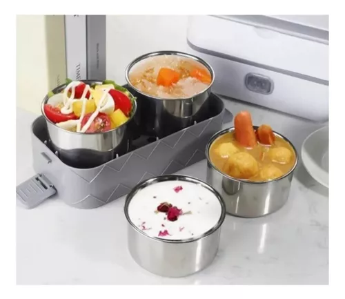 Lonchera para COCINAR y calentar comida al vapor, incluye cuatro recipientes metálicos con tapa, cable de poder y taza medidora de agua.
