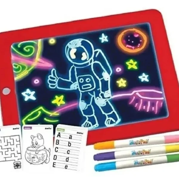 La mejor herramienta para cultivar la creatividad y dejar volar la imaginación de su hijo sin fin, con bolígrafos de neón de doble cara y plantillas de doble cara, las cuales al encender la luz led del sketchpad empieza a brillar el dibujo