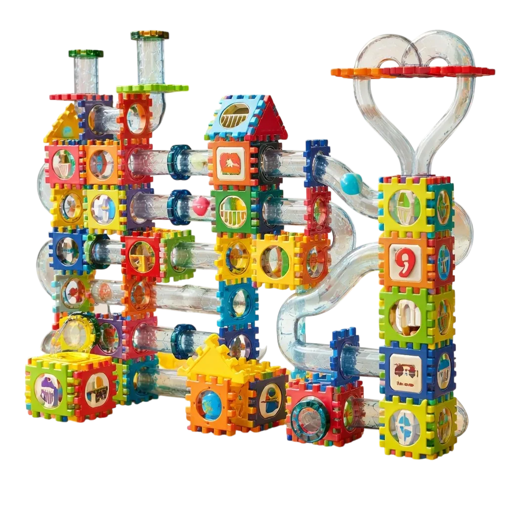 El set consta de 269 piezas : bloques resistentes, conectores, tubos transparentes y bolas. Los niños ensamblan estructuras tridimensionales de forma independiente, crean recorridos y observan cómo se mueven las bolas a través de los tubos. Esto fomenta la comprensión de las relaciones de causa y efecto y desarrolla el pensamiento ingenieril.