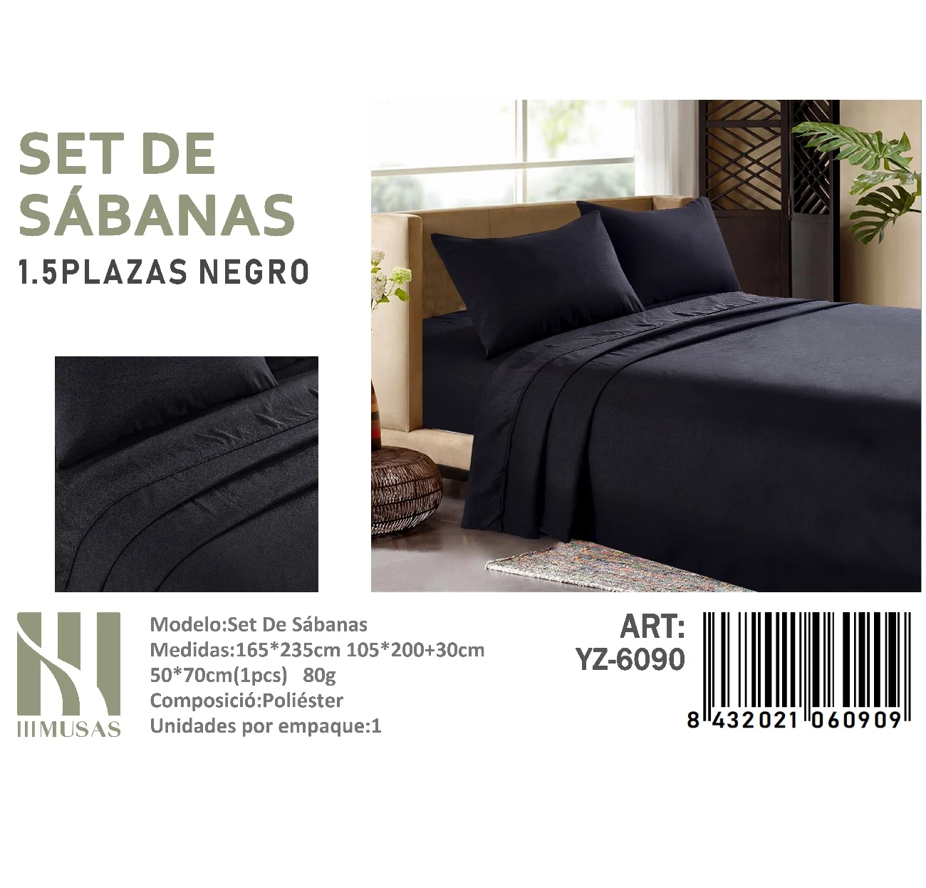 Set De Sabanas Plaza y Media Negro 150 Hilos + 1 Funda De Almohada